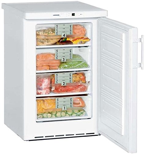 Image: Liebherr GP 1366 upright freezer with its door open, revealing four transparent freezer drawers. Each drawer is filled with various frozen food items, such as vegetables, meat, and prepared meals, and is labeled with a number for organization. The control panel is located at the top of the unit.