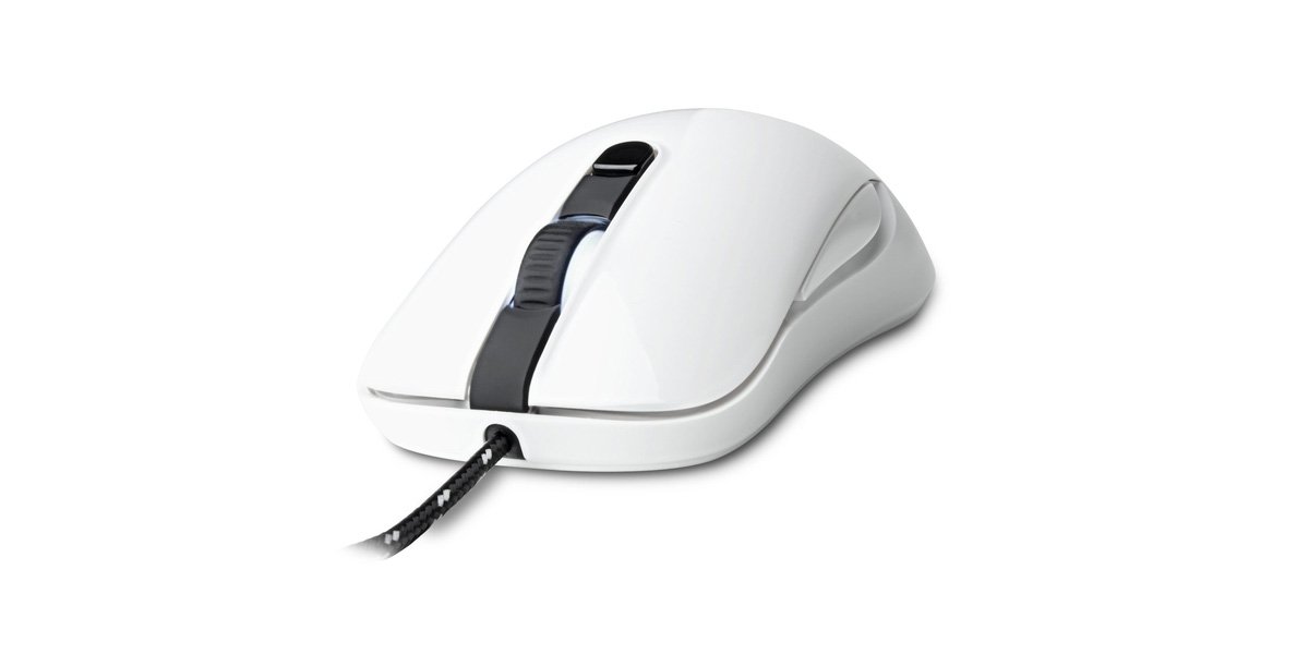 Image of the SteelSeries Kana Optical Gaming Mouse in white, showcasing its ambidextrous design, illuminated scroll wheel, and side buttons.