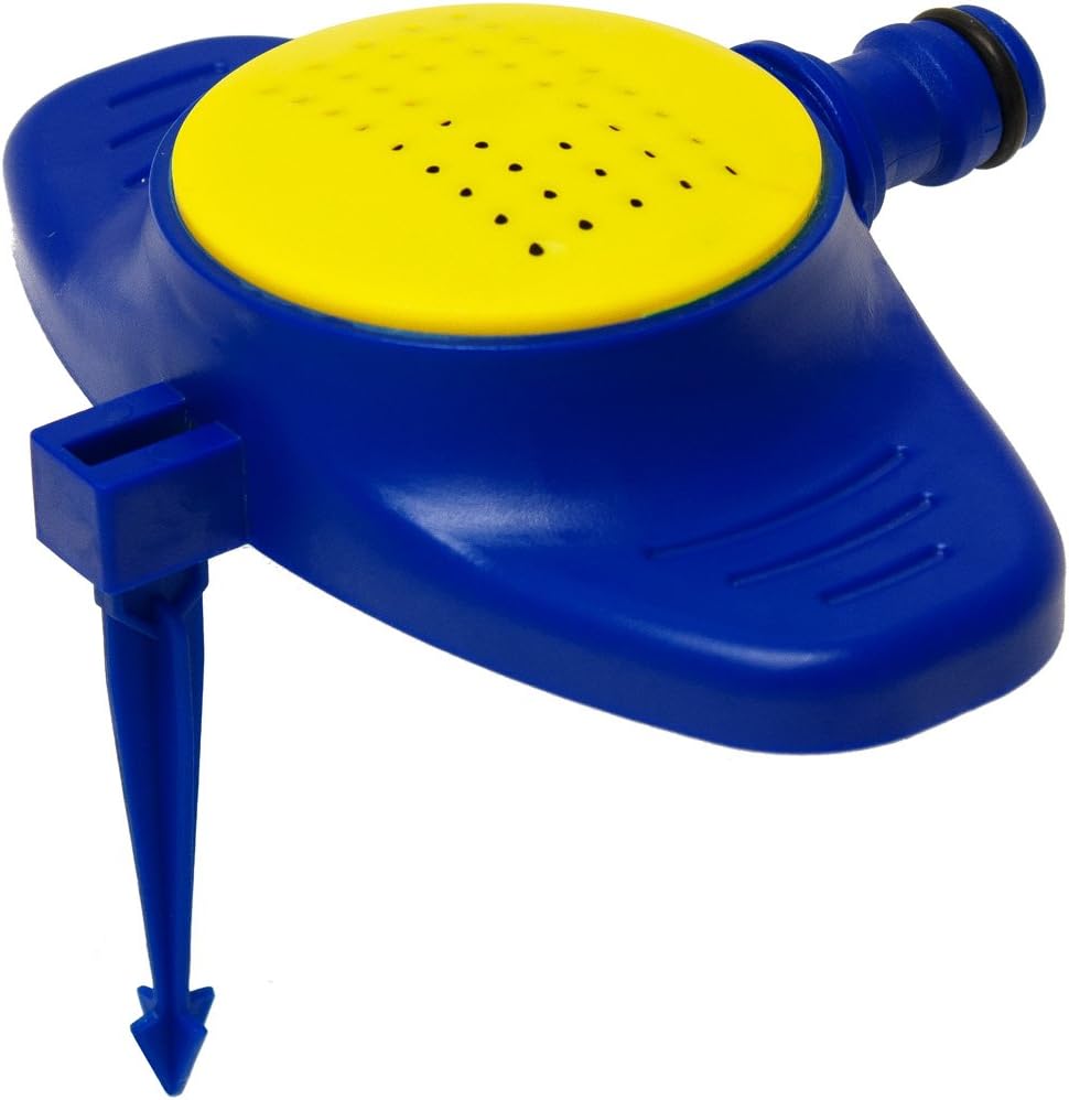 Figure 1: The Kinzo Impuls Sprinkler. This image displays the compact design of the sprinkler, featuring its blue base, yellow sprinkler head with water outlets, and the integrated ground spike for stability. The hose connection point is visible on the side.