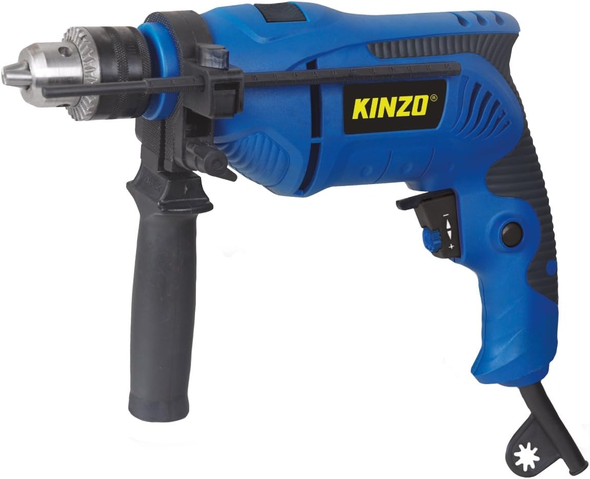 Figure 1: Kinzo 72192 230V Impact Drill. This image displays the complete drill unit, featuring its blue and black casing, the chuck at the front, the auxiliary handle, and the power cord extending from the rear. The Kinzo logo is visible on the side.