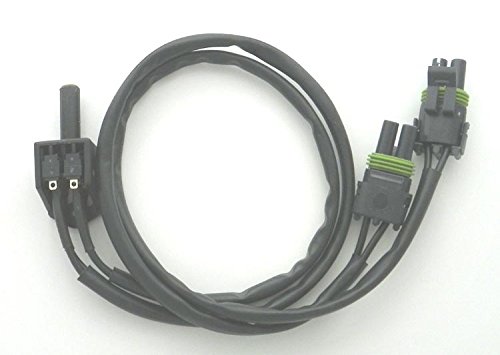 An image showing the Pwc Engine Neutral Safety Switch. It features a black plastic switch body with two pins, connected to a black wiring harness. The harness branches into two separate wires, each terminating in a black connector with a green seal, indicating a sealed connection type.