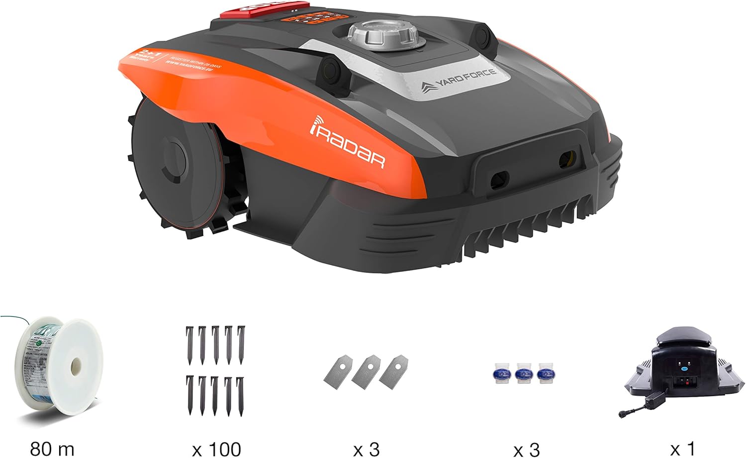 Image: The Yard Force Compact 280R robotic lawn mower shown with its complete set of accessories, including the charging station, perimeter wire, pegs, and spare blades.