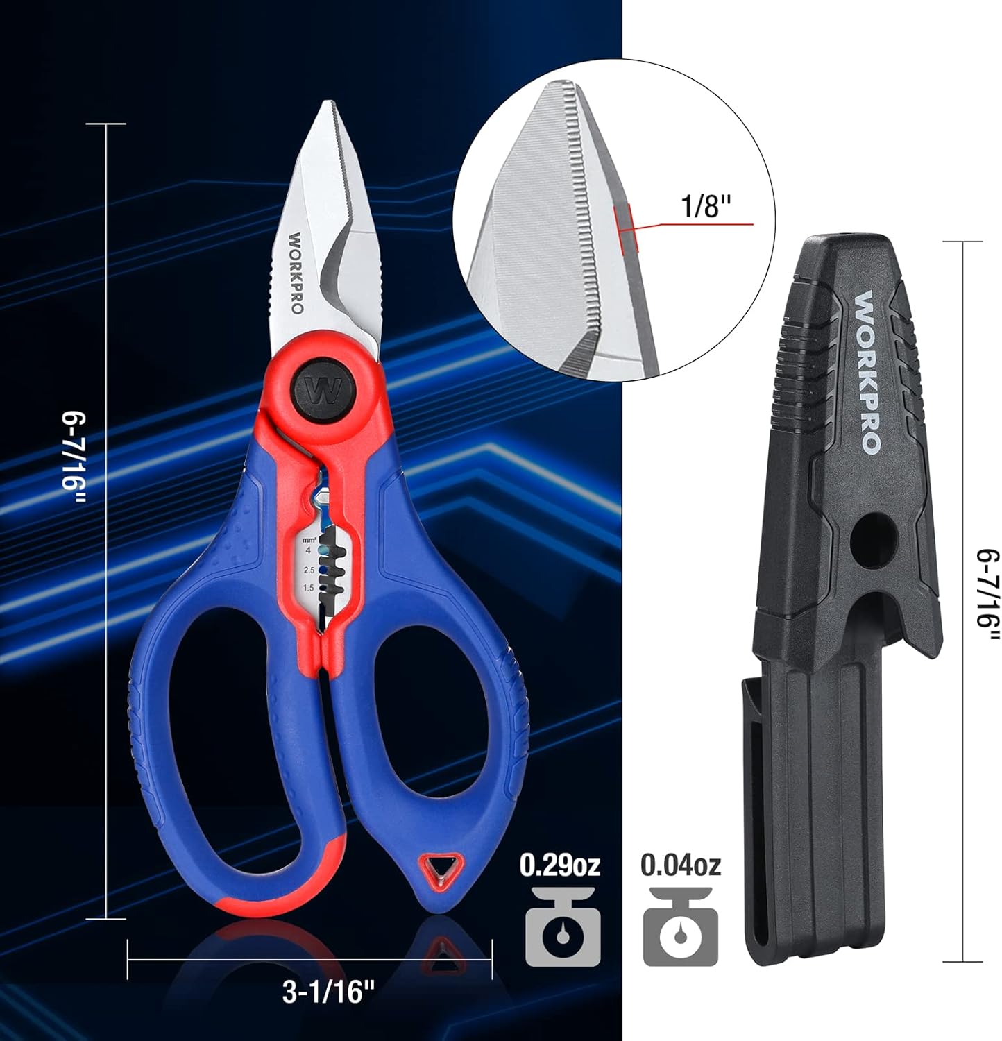 Image: WORKPRO 6.4-inch Electricians Scissors. The scissors feature blue and red ergonomic handles and stainless steel blades with a wire stripping and crimping mechanism near the pivot.