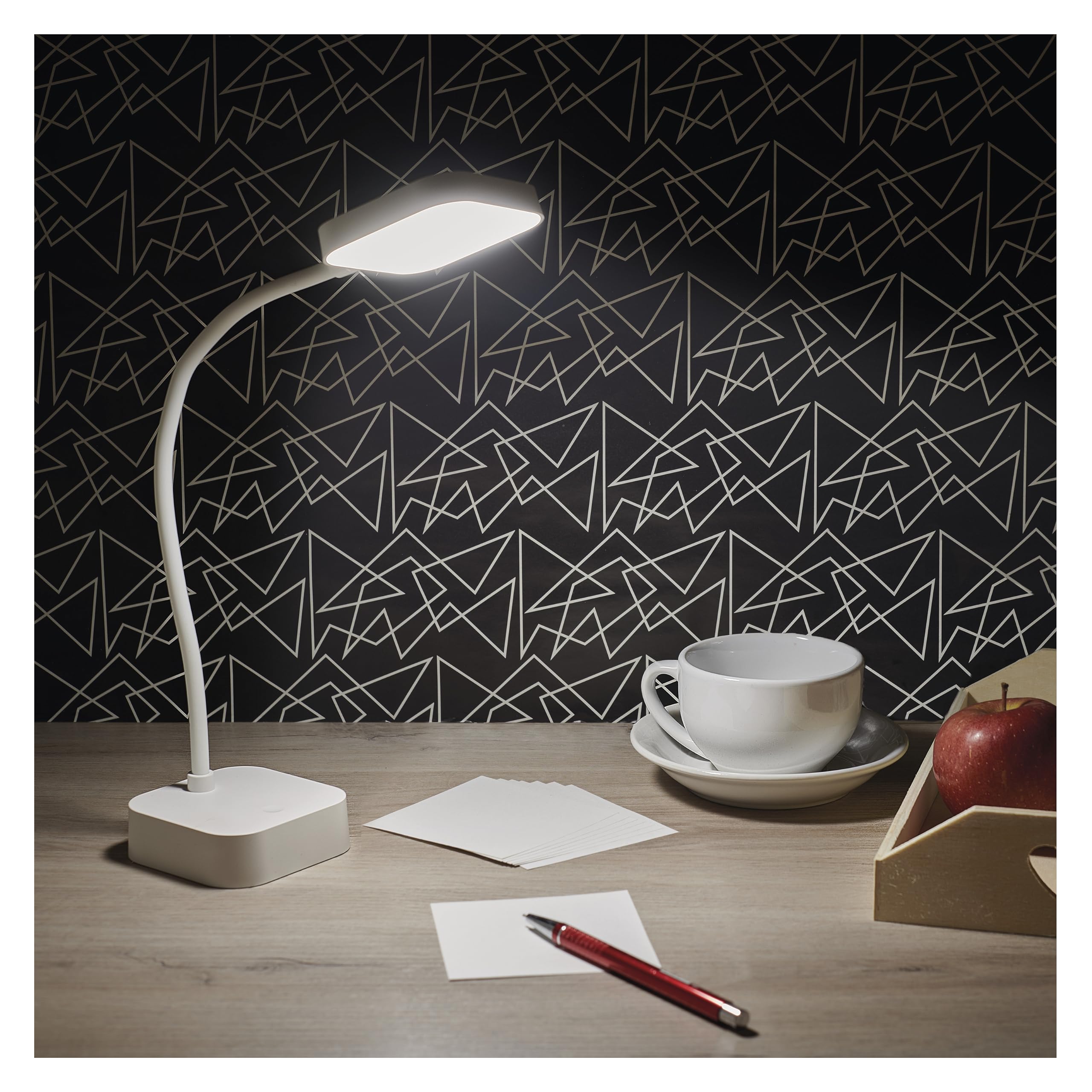 Image: The EMOS EMILY LED Desk Lamp in white, featuring a square base and lamp head connected by a flexible gooseneck.