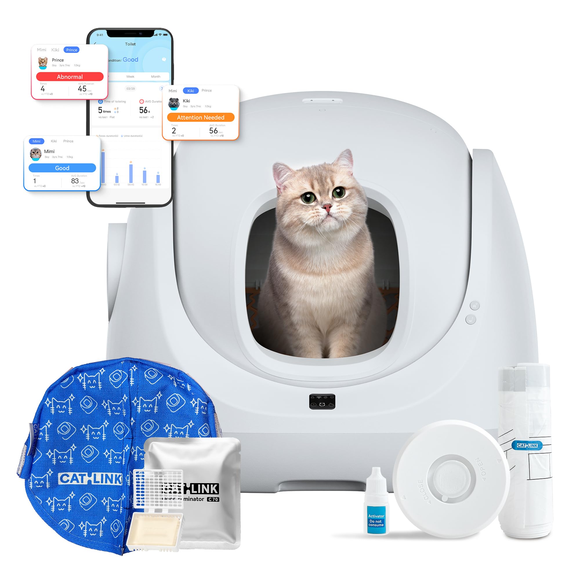 Image: CATLINK Baymax-Lite main unit with various accessories, including waste bags and odor eliminator.