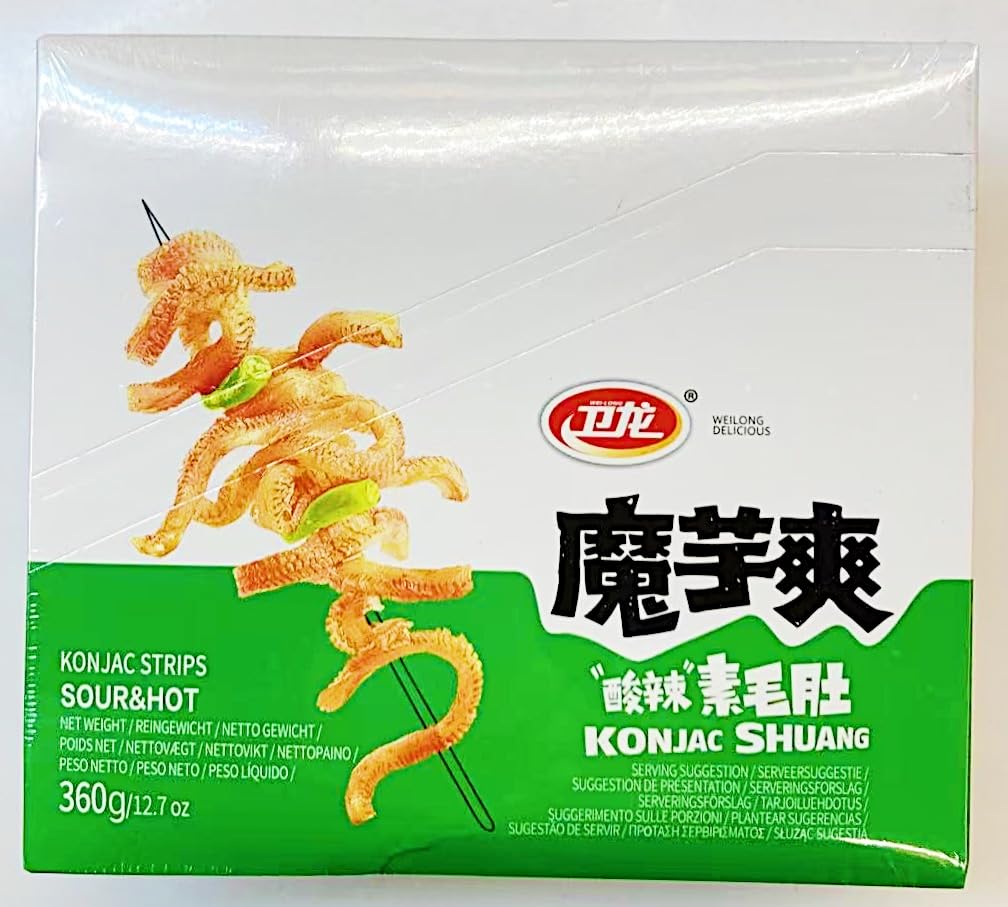 Gambar: Hareupeun view of the product packaging, showing the "Weilong Delicious" logo and "Konjac Shuang" text.