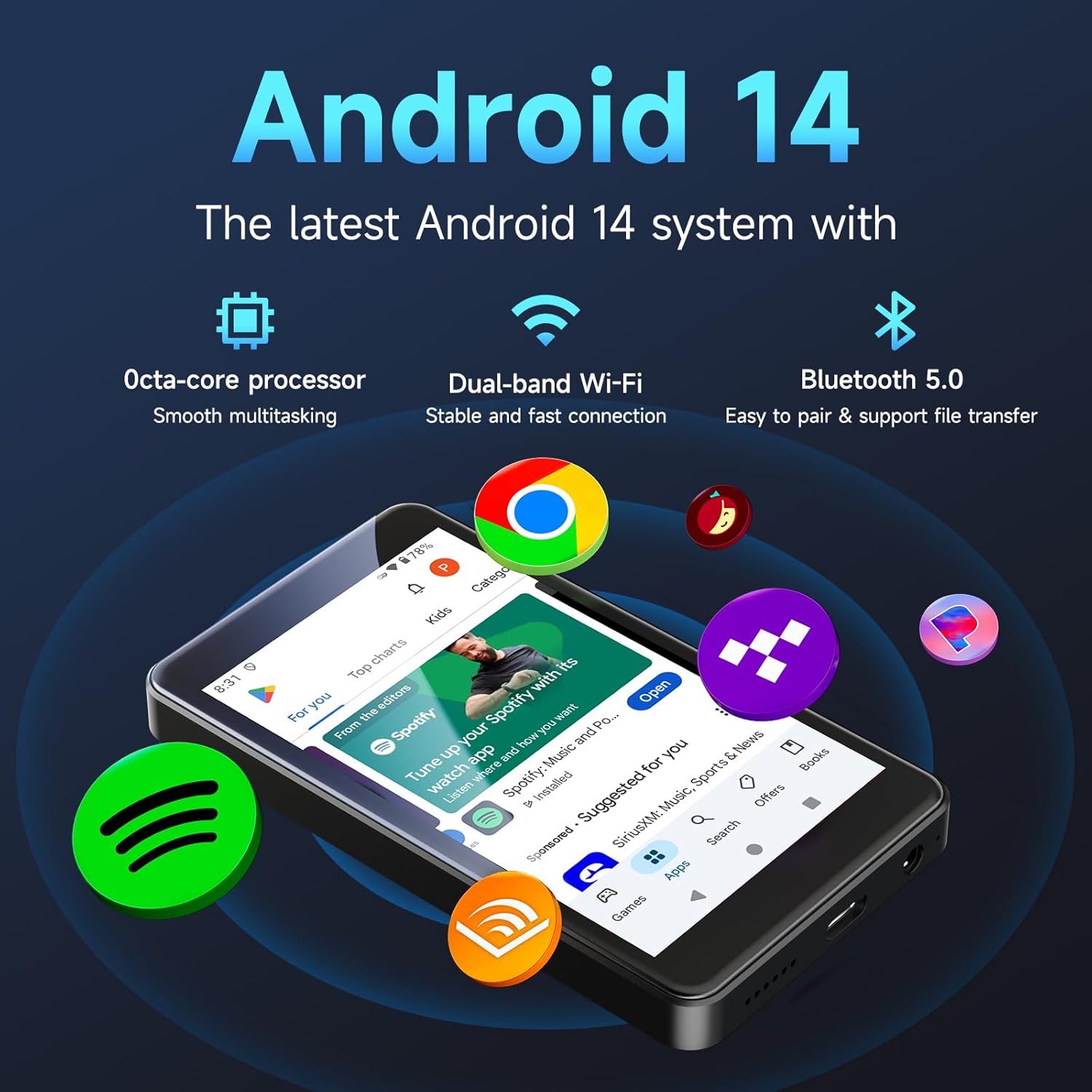 The PECSU G4S MP3 Player is a versatile portable music and media device running on the Android 14 operating system. It features a 4-inch touch screen, extensive storage, and connectivity options, designed for a rich multimedia experience with robust parental controls.