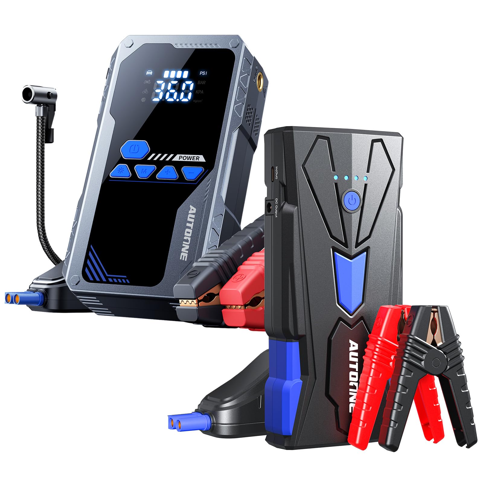 The AUTOONE JWA2/JS02 unit combines an 8000A jump starter and a 150PSI air compressor for comprehensive vehicle emergency support.