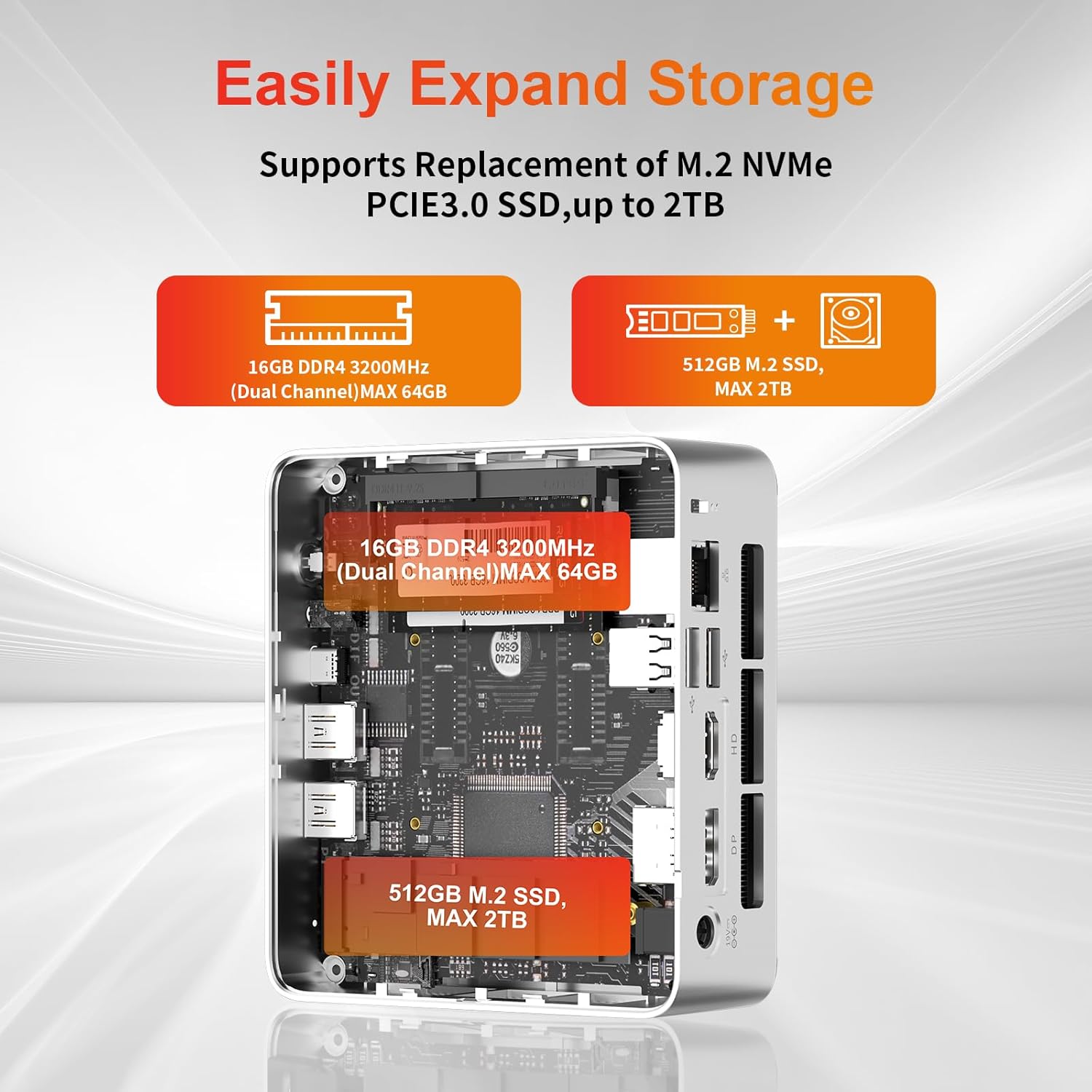 The mini PC allows for easy storage expansion. You can replace the existing M.2 NVMe PCIe 3.0 SSD with a larger one (up to 2TB) or add a 2.5-inch SATA SSD/HDD.